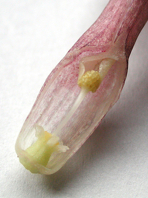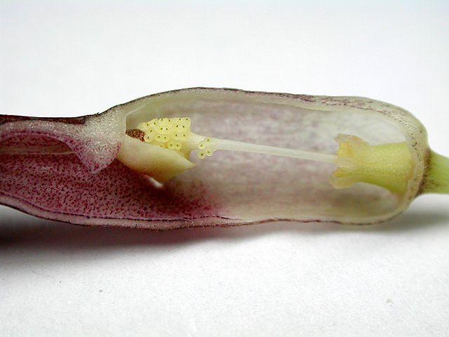 ケトル内部は白く、上部にうっすらとスポットが入ります。 匂いはよくわかりませんでした。イカ臭い(笑)です。 結構匂います。 前回の開花直後の観察では、記憶に残るほどの匂いではなかったのですが、、、 咲いてから日数が経過すると変化するのでしょうか。 |