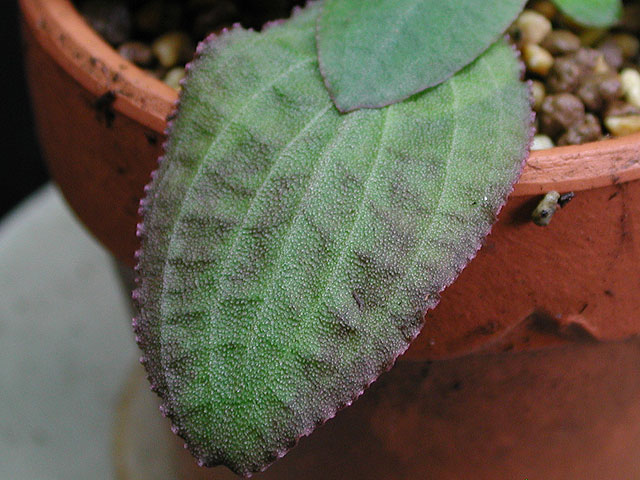 成長とともに赤みが増すのか、エッジの部分から葉の内側に向け赤みが差してきました。 スワは酸性の土壌と相性が良いようです。 |
